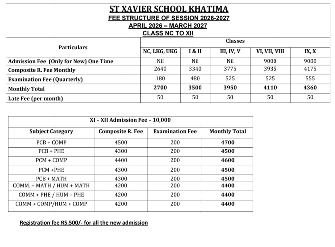 Saint Xavier School, Khatima is an English Medium School Managed by the Catholic Diocese of Bareilly. This institution is governed and administered by the St. Aiphonsus, Catholic Education Society which is charitable registered society under the Societies Registration Act XXI of 1860. This institution open for all boys and girls irrespective of caste creed and social status.